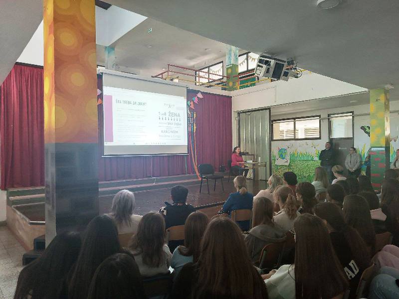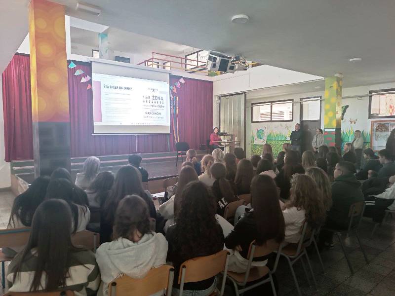 U srijedu, 15. listopada 2025. u predvorju naše škole održano je edukativno predavanje na temu Karcinom dojke, ginekološki karcinom i HPV. Predavanje je održala Rada Ivanović Pavić iz Udruge žena oboljelih od raka dojke Narcisa, a nazočili su mu učenici 9. razreda i djelatnici naše škole.